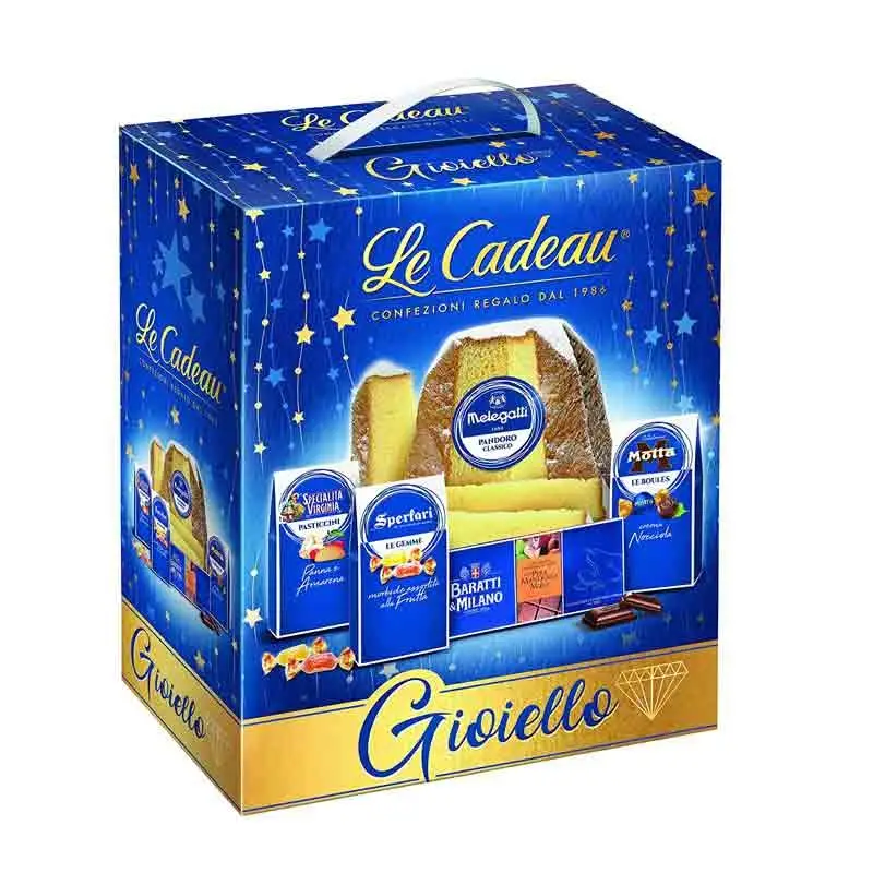 Pandoro Bauli gr.500, tavoletta cioccolato bianco Baratti, confezione Morbidelli Sperlari, pasticcini Dolci Attimi Vanoir e morbide gelatine frutta Sperlari