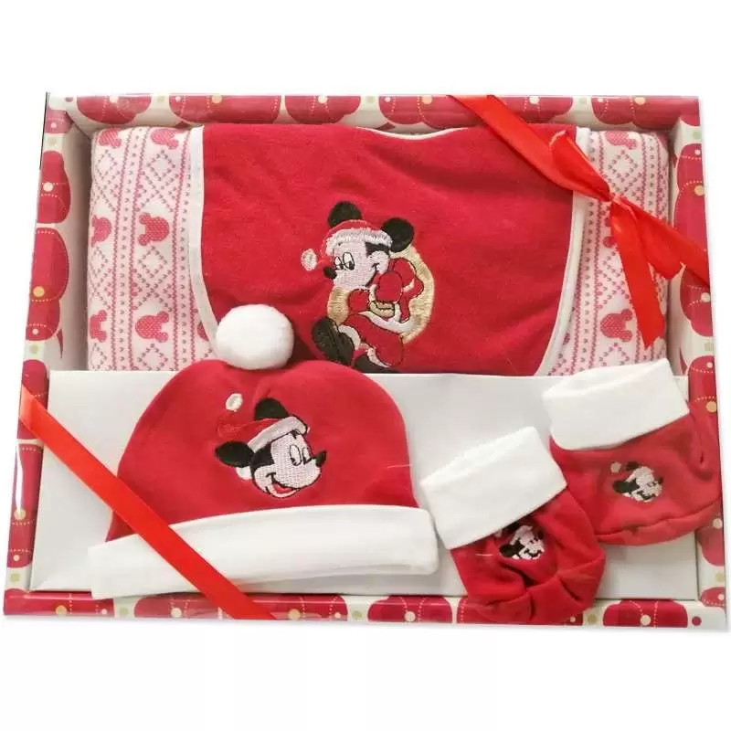 Una bellissima scatola regalo che include: bavaglino, copertina e parure di cappellino e scarpine in micro pile di Topolino Natalizio! Codice: WR2004