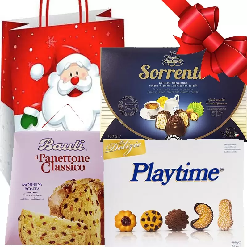 Un pensiero che non passerà mai di moda: un panettone Bauli classico, una confezione Crispo “Sorrento”, una confezione di dolcetti “Playtime” da confezionare con una busta shopper e una coccarda. Scorri per maggiori dettagli.