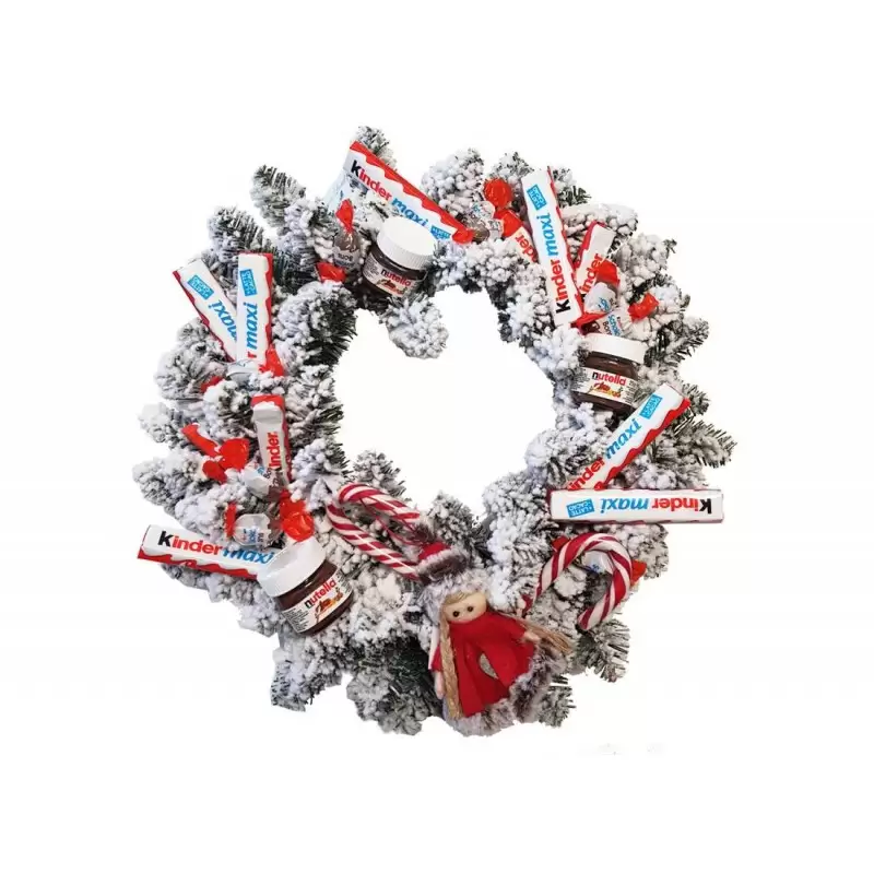 Avete mai pensato ad una ghirlanda Natalizia dolce? I golosi apprezzeranno moltissimo questo regalo: una ghirlnda da 30 cm, 3 barattolini di Nutella, una conf. di Choco Bons, 8 barrette Kinder, 8 Kinder Maxi, 2 candy cane rossi e bianchi e una decorazione Natalizia! Divertitevi a comporla!