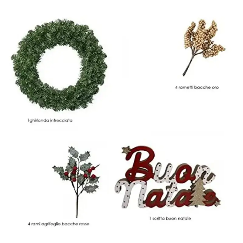 Una Bellissima corona verde artificiale da decorare con : 4 picks bacche oro, 4 pick agrifoglio, una scritta di legno ” Buon Natale”.