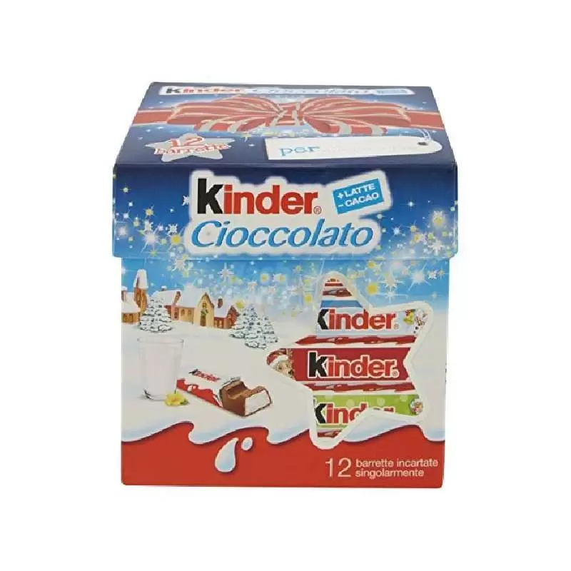 Un bellissimo cubo di cartoncino con grafiche natalizie assortite che contiene 12 barrette Kinder incartate singolarmente.