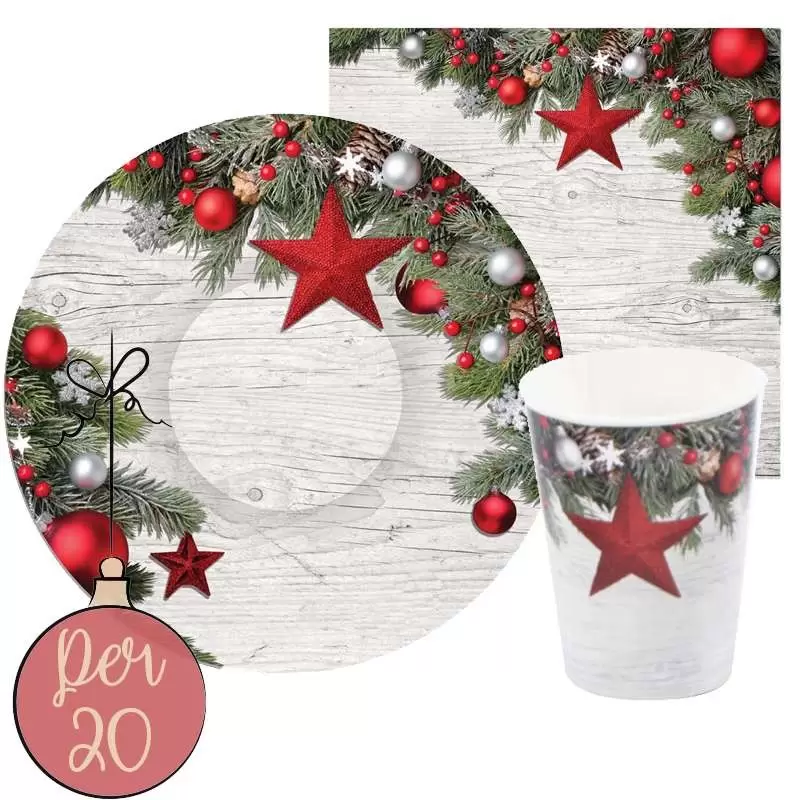 Un bellissimo coordinato tavola perfetto per Natale: 20 piatti, 20 bicchieri e 40 tovaglioli di carta 3 veli.