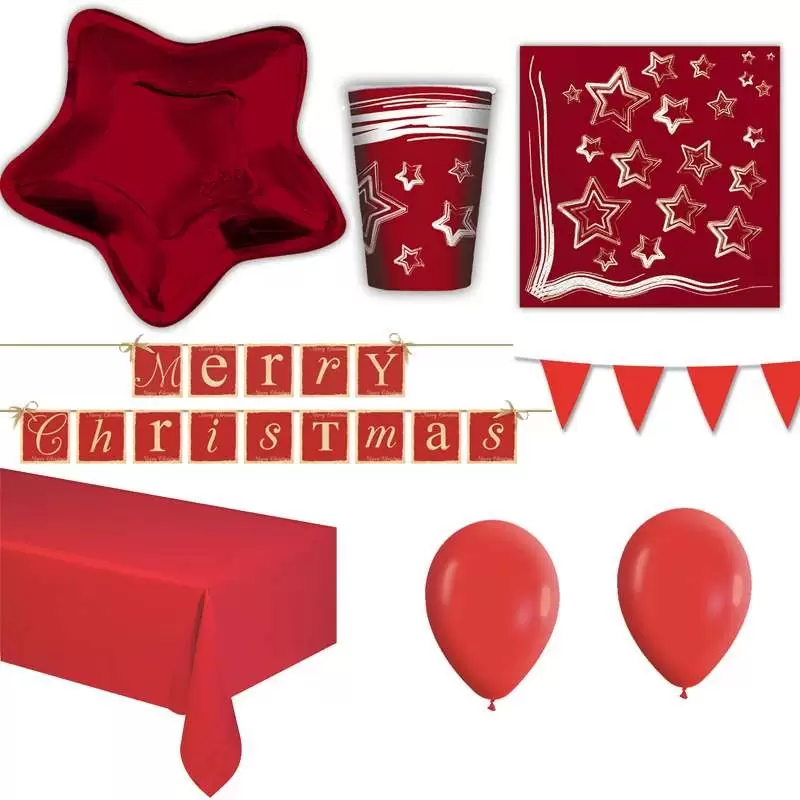 Riceverete tutto l’occorrente per un pranzo o una cena di Natale per 40 persone: 40 piatti a forma di stella, 40 bicchieri, 40 tovaglioli, una tovaglia rossa, bandierine triangolari rosse, una ghirlanda da comporre rossa e oro, 100 palloncini rossi in lattice.
