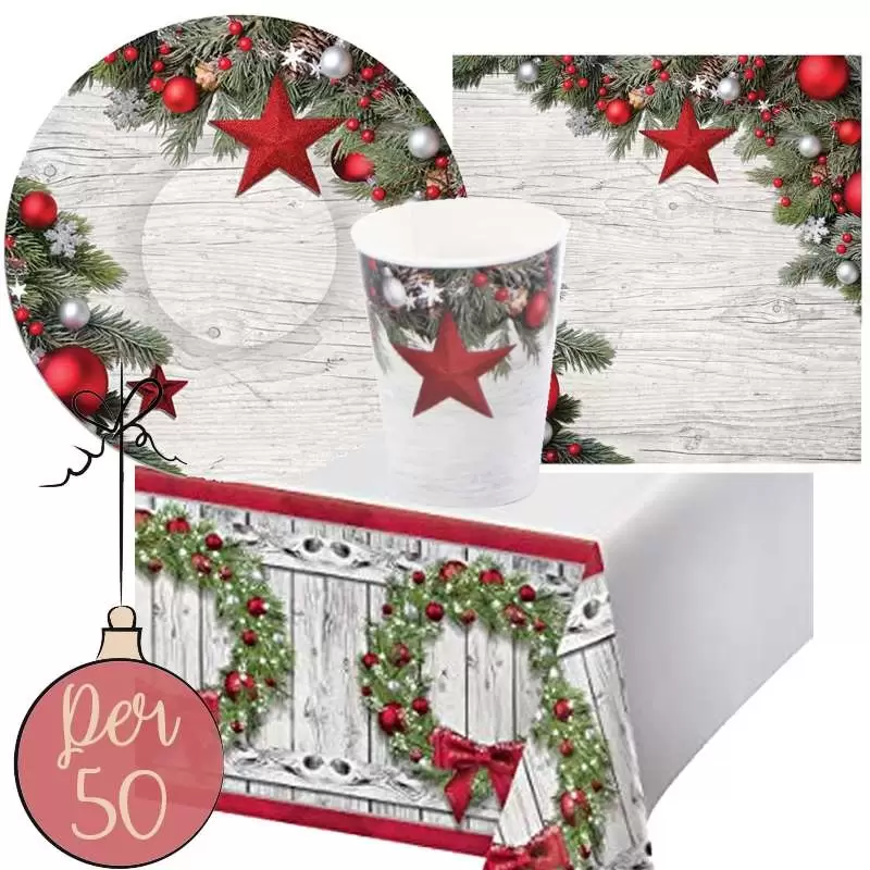 Un bellissimo coordinato tavola natalizio: 50 piatti, 50 bicchieri, 40 tovaglioli di carta e una tovaglia da utilizzare durante le festività.
