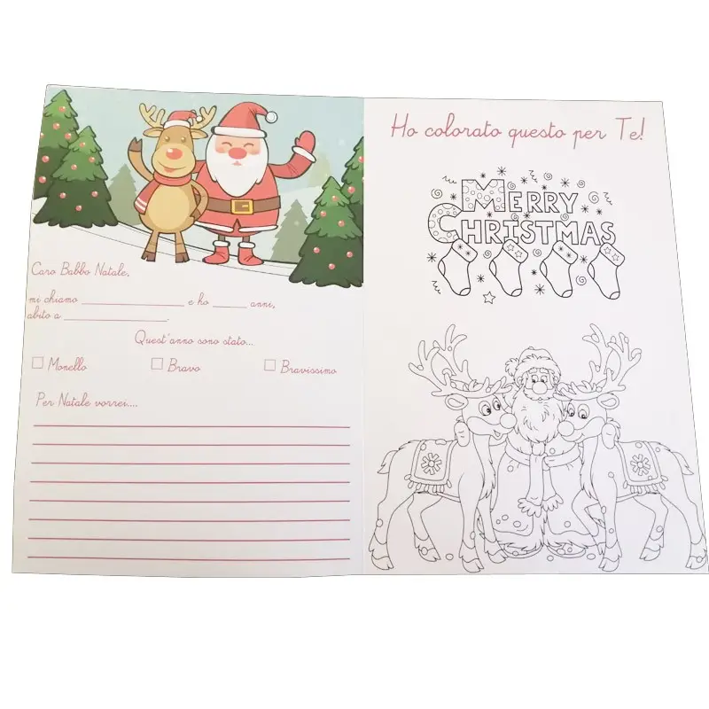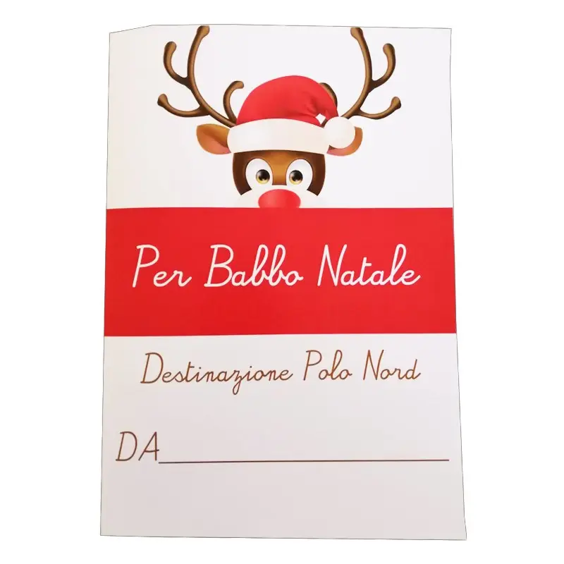Si può prendere un classico foglio bianco oppure acquistare questa meravigliosa letterina da compilare e colorare insieme al tuo bimbo. Stampata su un cartoncino formato A4 con grafica Natalizia da colorare. Ti invieremo anche un astuccio con 6 mini pastelli così il tuo bimbo potrà scrivere i suoi desideri, decorarla ,colorarla e finalmente inviarla a Babbo Natale.