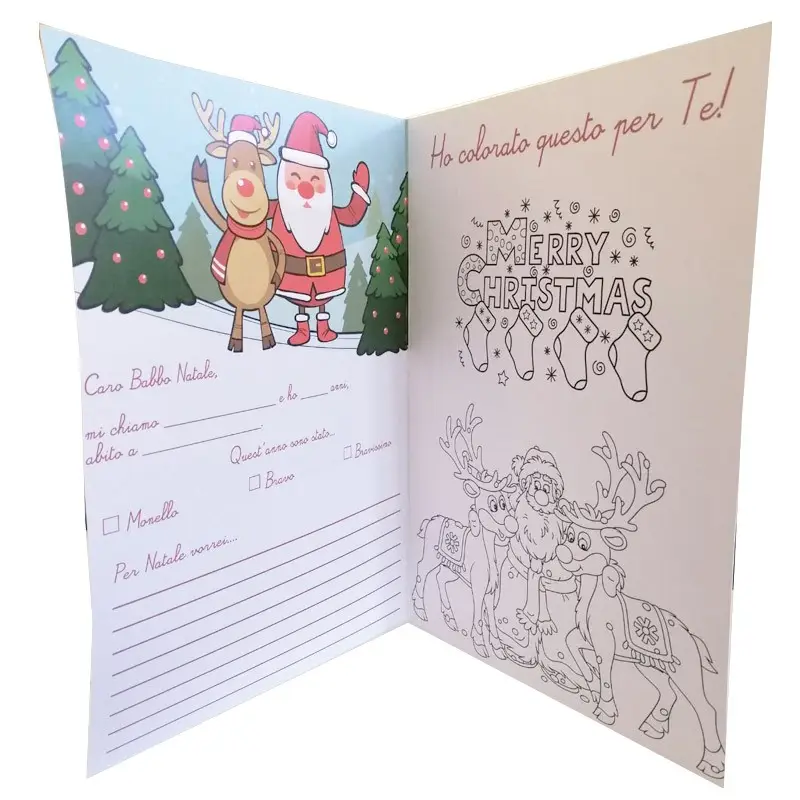 Si può prendere un classico foglio bianco oppure acquistare queste meravigliose letterine da compilare e colorare. Stampate su un cartoncino formato A4 con grafica Natalizia da colorare. Ti invieremo anche 5 astuccio con 6 mini pastelli così i tuoi bimbi potranno scrivere i loro desideri, decorarle ,colorarle e finalmente inviarle a Babbo Natale.