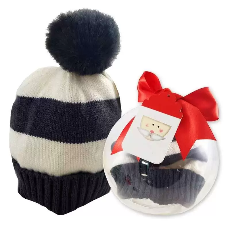 Riceverete il necessario per creare una bellissima pallina natalizia da regalare ad un neonato: una sfera di plastica resistente apribile da 15 cm di diametro in cui inserire un bellissimo cappello invernale con pon pon a strisce con interno felpato bianco (0-12 mesi), nastro, etichetta natalizia.