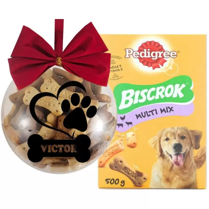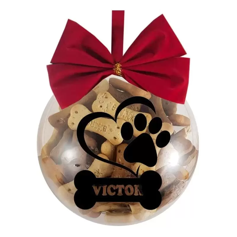 Bellissima idea regalo per il tuo amico a 4 zampe da comporre usando: una sfera in plastica da 15 cm di diametro, una confezione da 500 gr di biscotti per canu, 2 mt di nastrino rosso da 4 cm, un adesivo come in foto da personalizzare con il nome del vostro cucciolo.