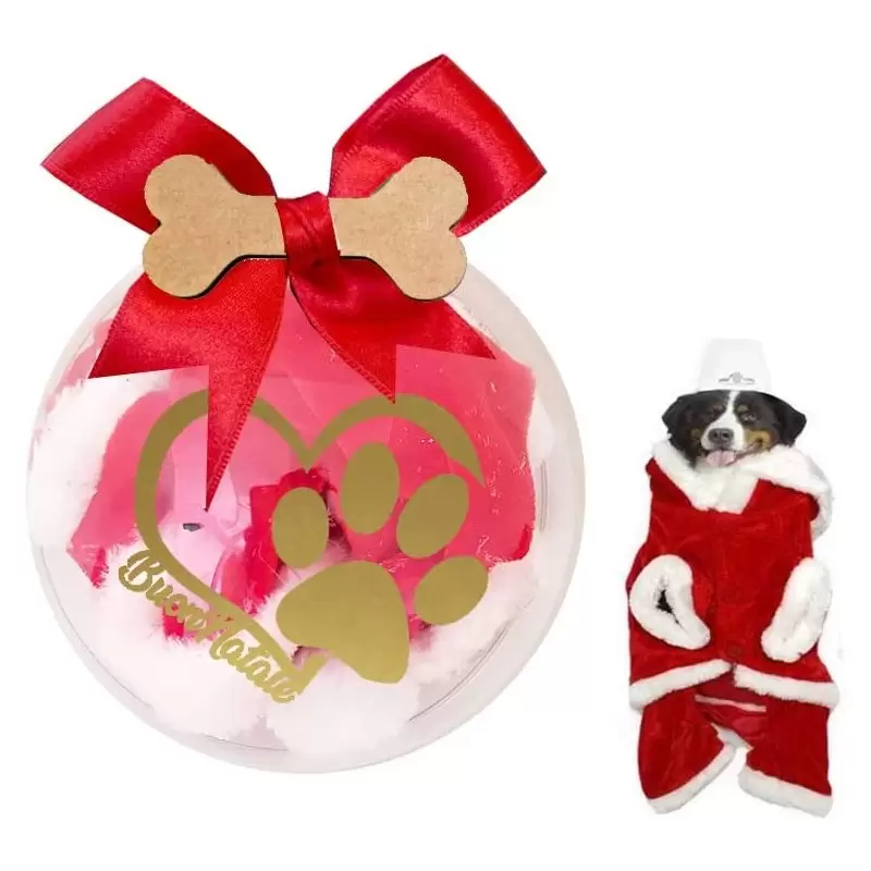 Una bellissima pallina di Natale da comporre utilizzando: una sfera di plastica trasparente da 15 cm, un nastro rosso da 4 cm per abbellire la decorazione, un cappottino Babbo Natale per cagnolini, una decorazione di legno a forma di osso, un adesivo come in foto da applicare alla pallina