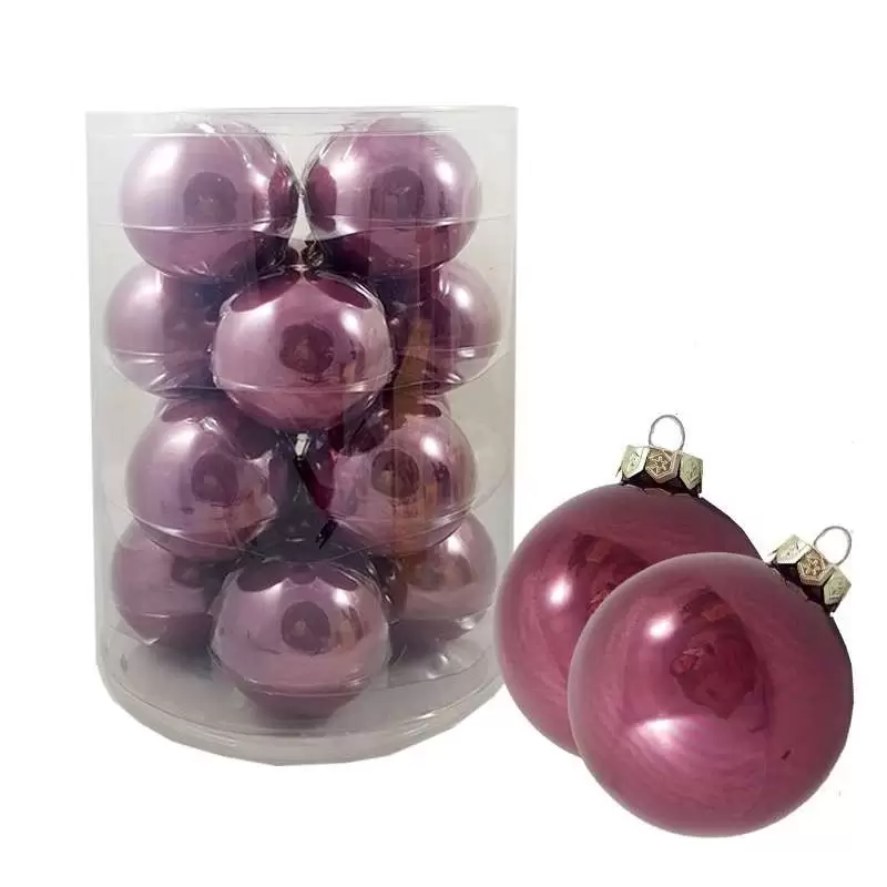 Una confezione da 16 palline di Natale di vetro malva. Diametro 8 cm. Codice: N16047