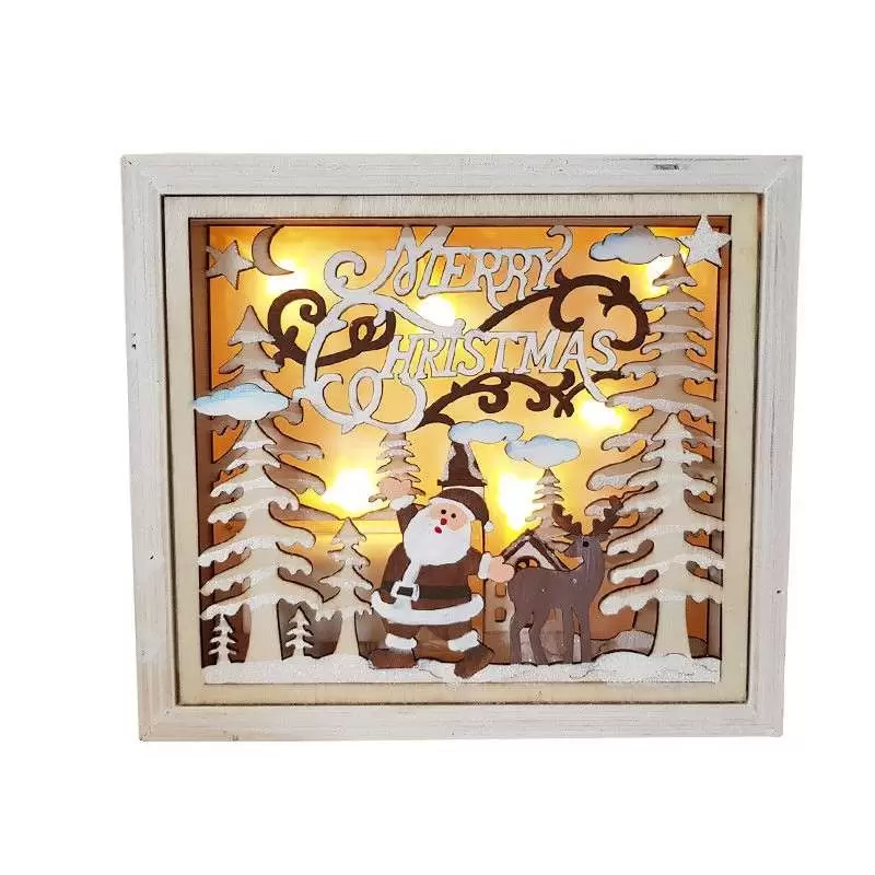 Riceverete una graziosissima scena natalizia piccola in legno da 20 x 18 cm che raffigura un paesaggio invernale con Babbo Natale e la scritta “Merry Christmas”. Codice: 324792B